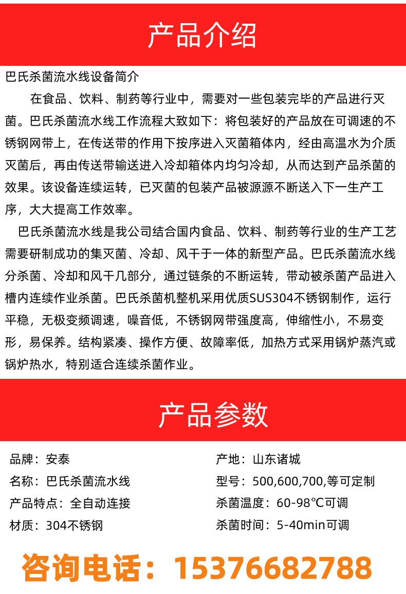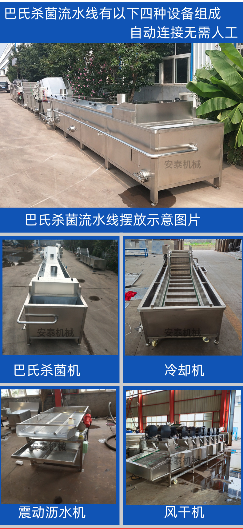 巴氏杀菌机水循环由出料端往进料端循环,使杀菌温度更均衡,循环水泵前边加有过滤系统,以防止槽内杂质抽到泵中,长时间在杀菌(冷却)槽内循环。设备有单独的控制系统,操作简单维修方便,设备顶部配有排湿口,有效排出因水蒸汽形成的热流,冷却段设备配有气泵,气泡鼓浪运作模式,在产品输送过程中降低了产品表面的温度,不仅对产品进行摊平的作用,避免由于产品堆积所造成的冷却不均,还可以对产品表面进行二次清洗。