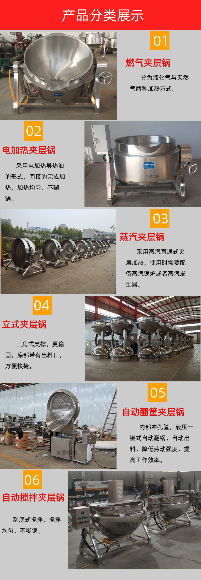夹层锅可用于烧水,炒菜,熬稀饭,熬粥,熬汤,煮饭,化糖,化胶,熬油,煮面,炒馅料(比如豆沙馅,莲蓉馅,月饼馅,绿豆馅等),煮笋干,煮卤制品(比如豆腐干,肉制品,毛豆等),卤制品(比如鸡爪,鸡翅,卤蛋,鸭爪,鸭脖,猪耳朵等),酱油等食品行业。广泛应用于糖果制药、乳品酒、糕点、饮料、蜜饯、罐头等食品加工,也可用于大型餐厅或食堂熬汤烧菜、炖肉、熬粥等,是食品加工提高质量、缩短时间、改善劳动条件的好设备